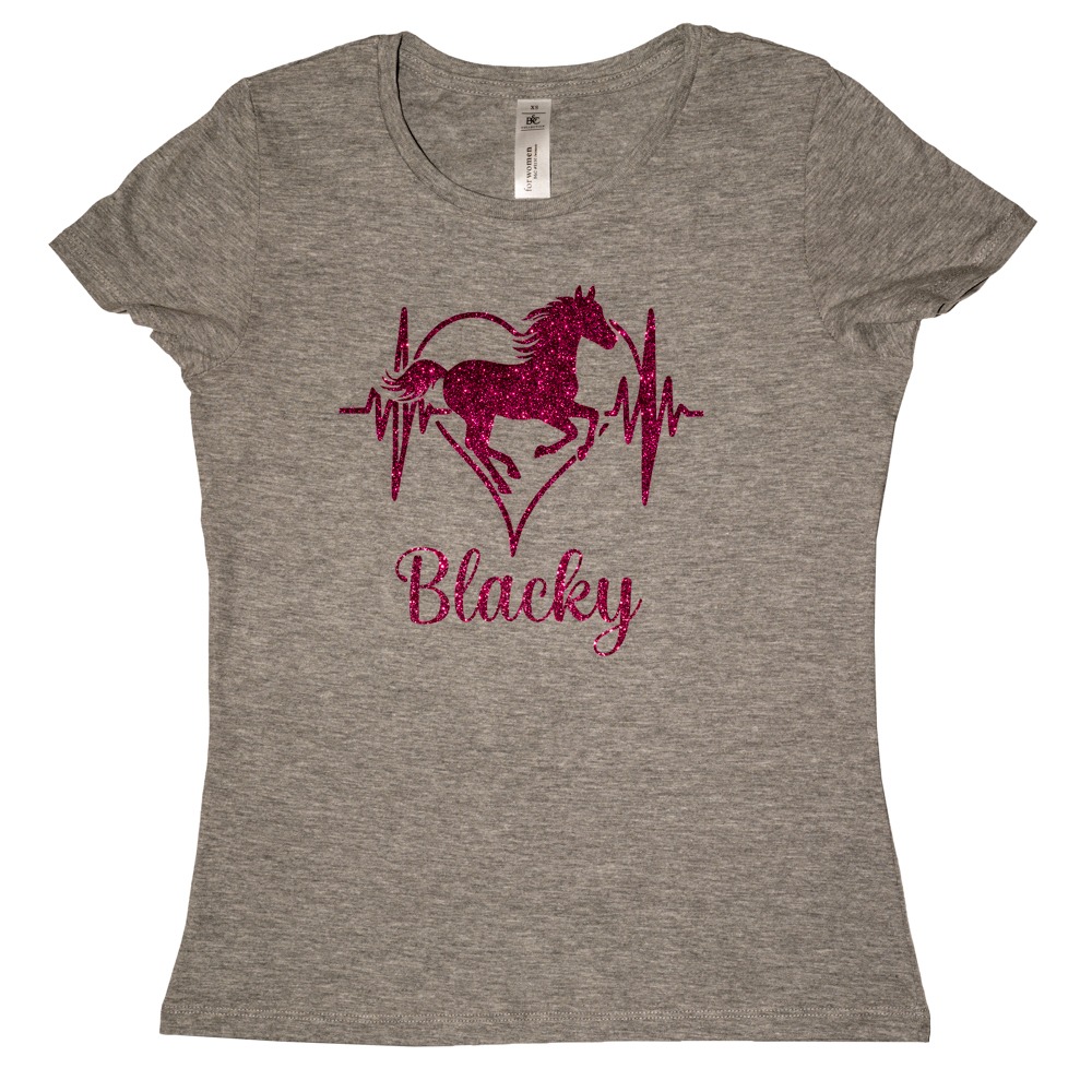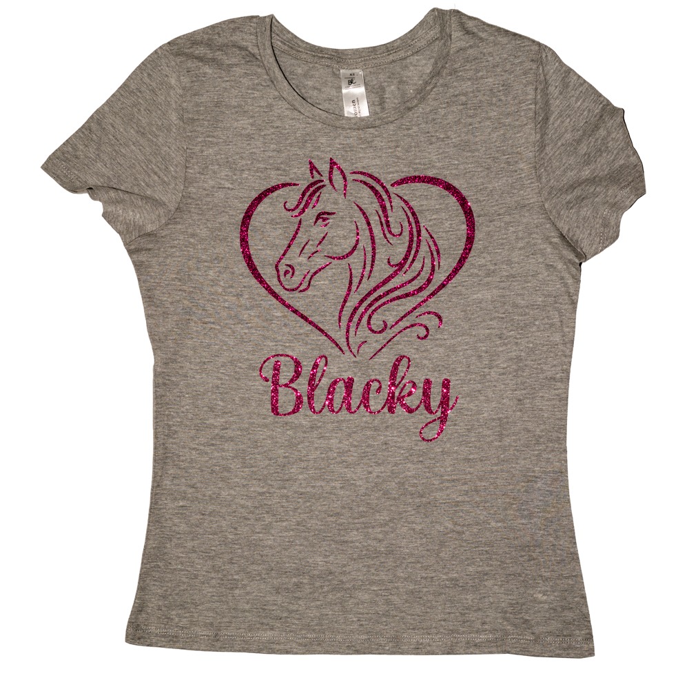 Kies uit twee prachtige glitter paardenafbeeldingen en maak het helemaal van jou door de naam van je paard in glitterletters onder de afbeelding te laten drukken. Zo draag je niet zomaar een shirt, maar een stijlvol eerbetoon aan jouw trouwe viervoeter. Geef in de opmerking tijdens het afrekenen de naam van je paard door en wij zorgen ervoor dat deze op het t-shirt gedrukt wordt.