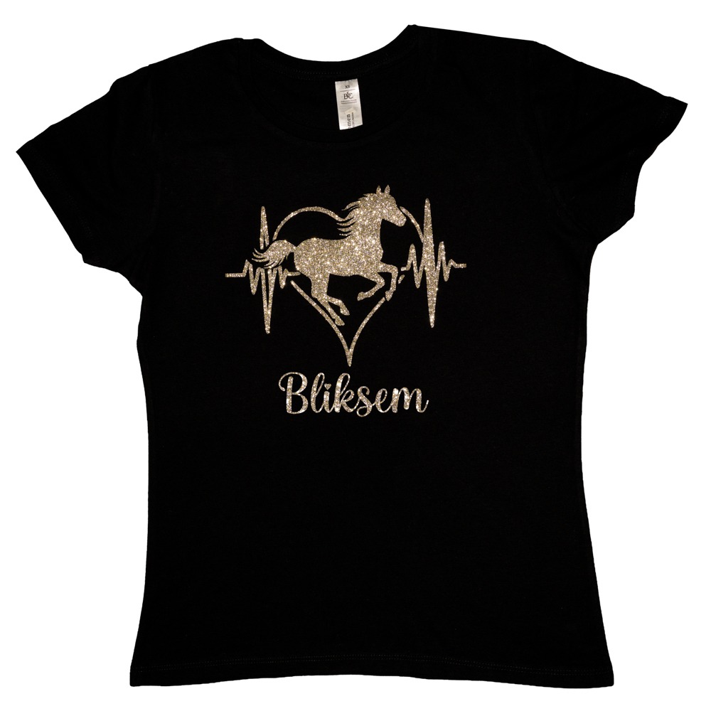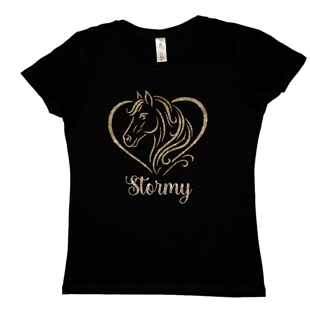 Kies uit twee prachtige glitter paardenafbeeldingen en maak het helemaal van jou door de naam van je paard in glitterletters onder de afbeelding te laten drukken. Zo draag je niet zomaar een shirt, maar een stijlvol eerbetoon aan jouw trouwe viervoeter. Geef in de opmerking tijdens het afrekenen de naam van je paard door en wij zorgen ervoor dat deze op het t-shirt gedrukt wordt.